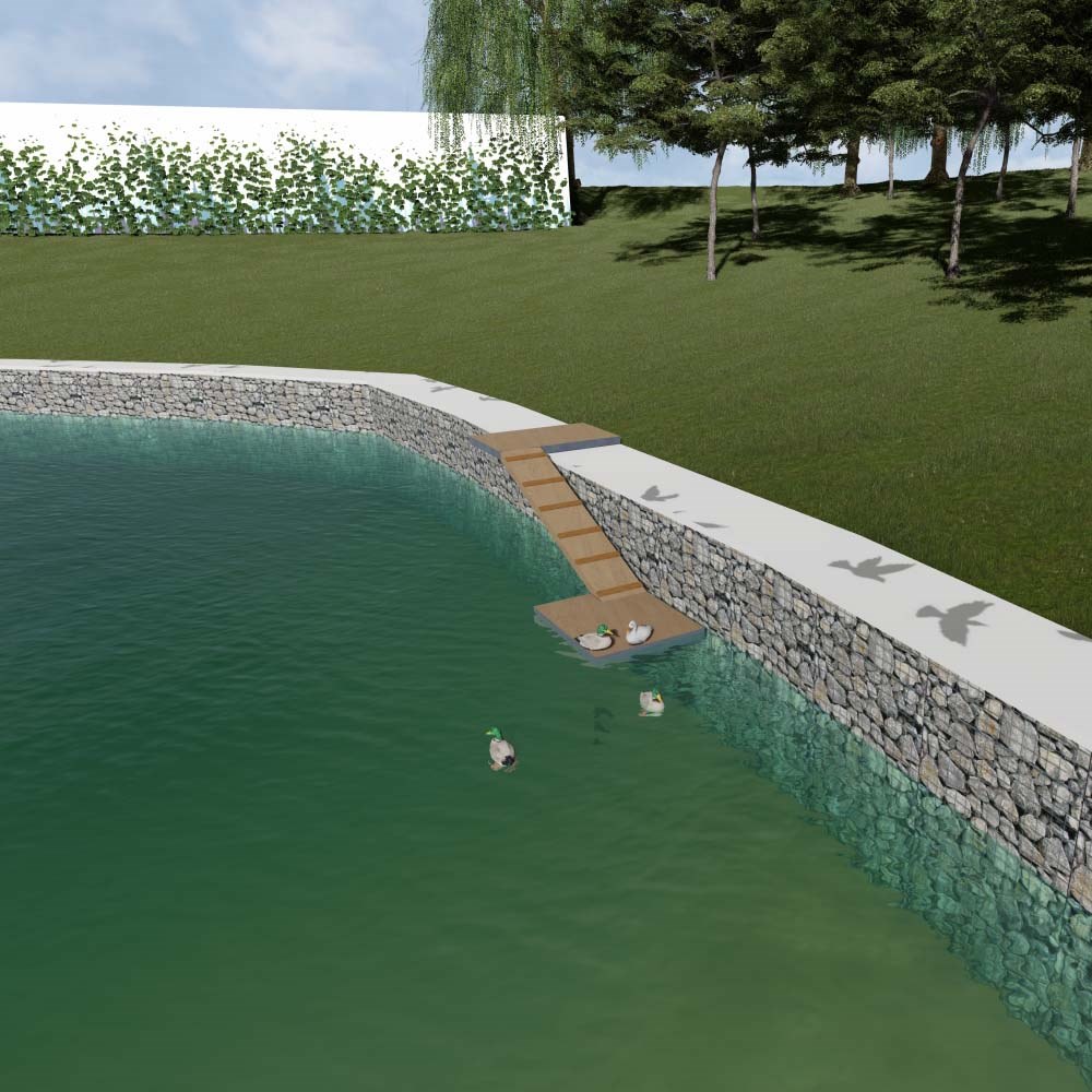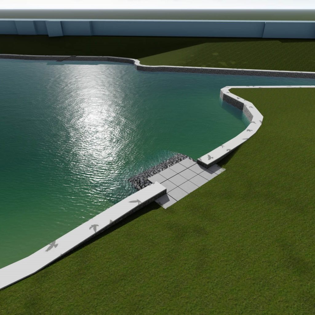 Берегоукріплення озера Пташине направлене на стабілізацію берегової лінії та запобігання підтоплення прилеглої території. Берегоукріплення запроєктоване напівукісного типу,  із застосуванням габіонних конструкцій – габіонів коробчастого типу та матраців, заповнених природнім каменем. Для безперешкодного доступу тварин та птахів до водойми передбачені пониженні майданчики з укісним кріпленням та спеціальні дерев’яні спуски.